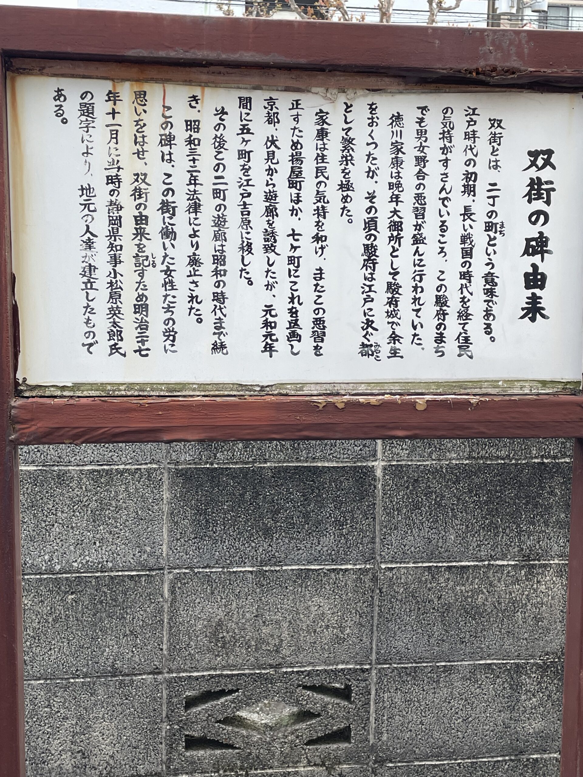 「双街(そうがい)」とは、江戸時代に徳川家康が駿府(現在の静岡市葵区安倍川町周辺)に設けた、日本初の官許遊郭である「二丁町(にちょうまち)遊郭」の別称・雅称です。