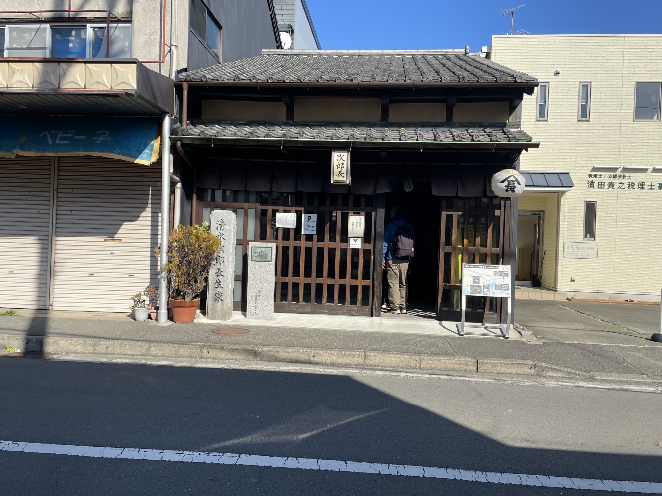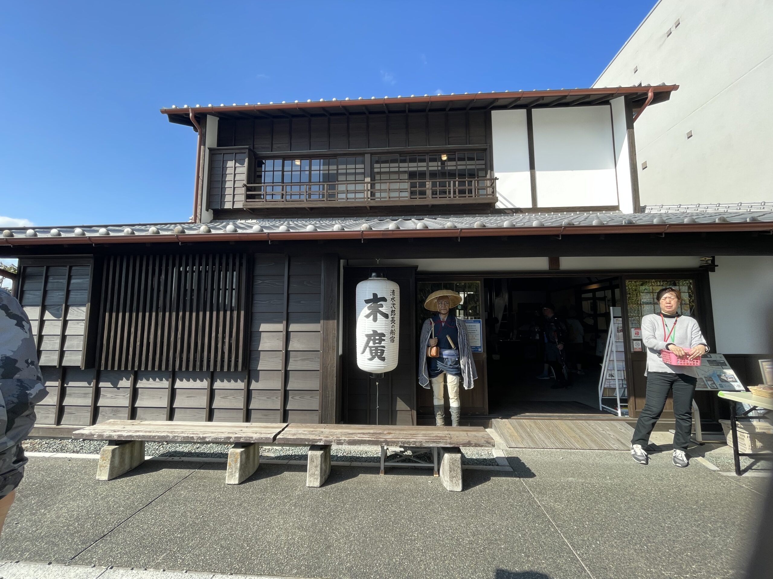 途中、「IAIスタジアム日本平」外の東屋で昼食をとり、そのまま龍華寺、鉄舟寺(ウォーキングクラブでおじゃまするのでお参りはカット)、清水次郎長の生家前を通過し、清水次郎長が晩年に経営した船宿「末廣」を復元した記念館へ。