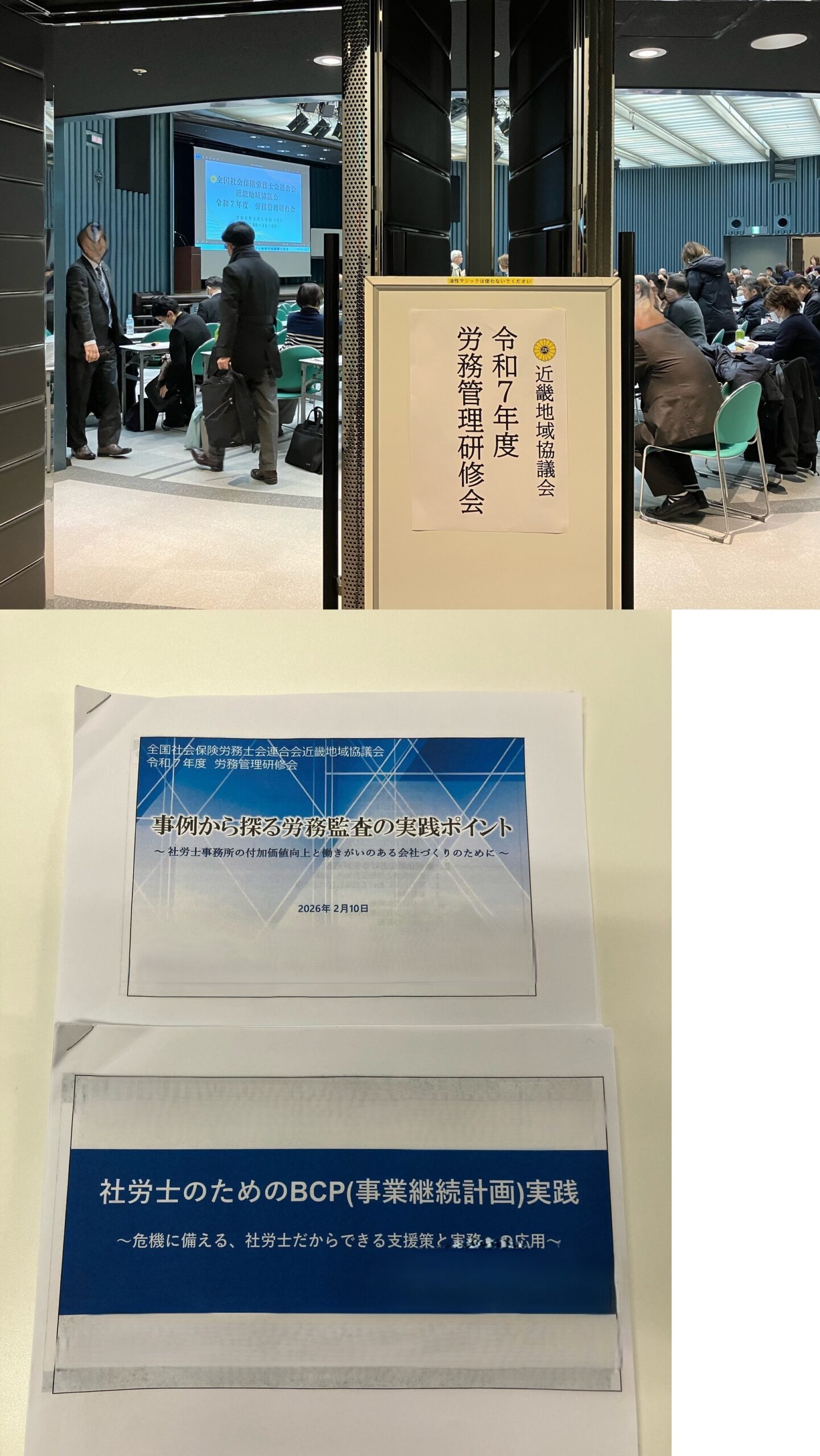 社労士会主催のセミナーに参加しました。今回は近畿圏の各会から約200名ほど集まりました。 セミナーの内容は、2025年6月社労士法第9次改正により、相談、指導業務の一環として実務慣行で行っていた「労務監査」が、法律上の正式な業務として社労士法に付記され、対応事例や実践ポイントを学び、もう一つは「BCP(事業継続計画)」実践。どちらも企業の経営リスク管理として重要です。これまでの実務経験を振り返ったり、知識のアップデート、今後の業務活用に生かせる貴重な時間でした。 「労務監査」☛目的にあわせて対応いたします!「BCP対策」☛何を優先順位に始めればよいか、見直せばよいかを一緒に考えていきましょう。!  是非!HALZにお問合せください。 I attended a seminar hosted by the Labor and Social Security Attorneys Association. This time, About 200 people gathered from kinki region. The ‘Labor audit,’ which had been carried out as part of consultation and guidance work based on practical experience, has been officially added to the act as a formal duty. We learned about casestudies and practical points regarding this. The second topic was the practical implementation of ‘BCP (Business Continuity planning).’ Both are important tasks for corporate management risk management. Based on actual experience, I was able to update my knowledge and deepen my understanding of key points through the lecturer’s examples. “Labor Audit” ☛ We will respond according to your objectives! “BCP Measures” ☛ Let’s think together about what should be prioritized and how to review it. Please feel free to contact HALZ !